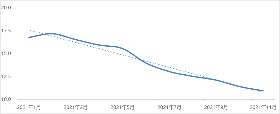 圖2 2021年1-11月豬肉電商市場價格走勢(元/斤)?